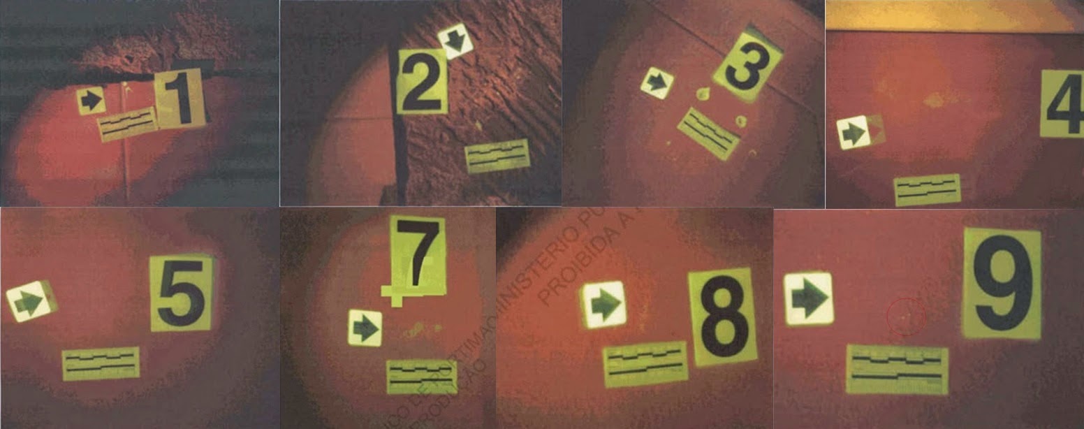 Las manchas de sangre mencionadas anteriormente fueron separadas por zonas y referenciadas como vestigio nº 1 aquellas encontradas en el suelo de grava, vestigio nº 2 las manchas de sangre que fueron encontradas en parte superior del muro y vestigio nº 3 las manchas encontradas en el suelo en la zona de adoquines.